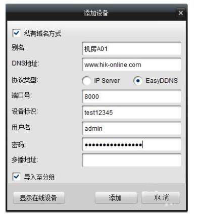 選擇私有域名方式添加,協議類型選擇成海康DDNS,填寫設備域名、用戶名、密碼,即可正常使用iVMS-4200客戶端軟件訪問設備。