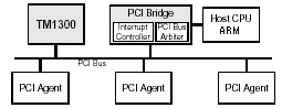 本方案采用了SAMSUNG的S3C2510(ARM940T內(nèi)核)和PHILIPS的Trimedia1300(TM1300) 數(shù)字信號處理器,ARM940T內(nèi)置了PCI2.1規(guī)范的總線接口,Trimedia1300可以作為PCI的MASTER和SLAVE,基本架構如圖 -1。