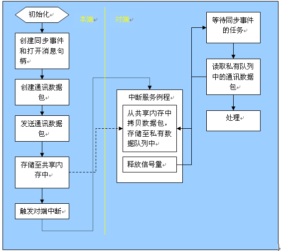 過程說明:本端處理器作初始化,創(chuàng)建同步事件,打開消息通訊句柄, 同步事件用于讀取數(shù)據(jù)時任務阻塞,然后創(chuàng)建通訊數(shù)據(jù)包并且發(fā)送,發(fā)送例程將數(shù)據(jù)存儲在共享緩沖區(qū)內(nèi),最后觸發(fā)對方中斷。對端處理器進入中斷響應,首先中斷例程分析共享數(shù)據(jù)區(qū)的通訊數(shù)據(jù)狀態(tài),發(fā)現(xiàn)某通道有新的未處理數(shù)據(jù)后,將其拷貝至自己的私有內(nèi)存空間,并清理自己的共享數(shù)據(jù)區(qū)狀態(tài),然后釋放在等待中的通訊任務的信號量,使讀通訊數(shù)據(jù)包的任務解除阻塞狀態(tài),從私有數(shù)據(jù)區(qū)讀取通訊數(shù)據(jù)包并作相應處理。