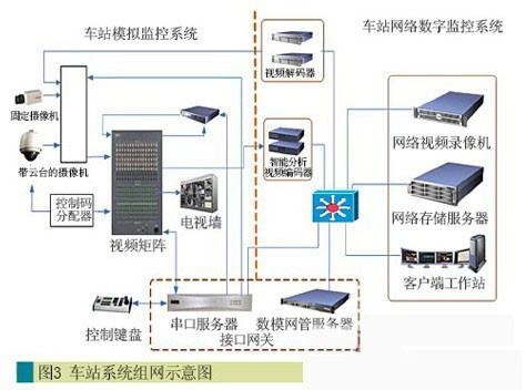 現(xiàn)階段地鐵交通視頻監(jiān)控系統(tǒng)中,會(huì)牽涉大量的模擬視頻設(shè)備和數(shù)字視訊設(shè)備,典型的模擬設(shè)備有矩陣、字符迭加器、模擬攝像機(jī)、云臺(tái)、多畫(huà)面分割器等,典型數(shù)字設(shè)備有網(wǎng)絡(luò)視頻錄像機(jī)、存儲(chǔ)服務(wù)器、安防平臺(tái)服務(wù)器、安防管理服務(wù)器、接口網(wǎng)關(guān)、磁盤(pán)陣列、編碼器、譯碼器、數(shù)字回放終端等。該方案能夠使這些數(shù)字和模擬設(shè)備融合在一個(gè)系統(tǒng)中,使兩者之間能夠互聯(lián)互通、互訪互控。